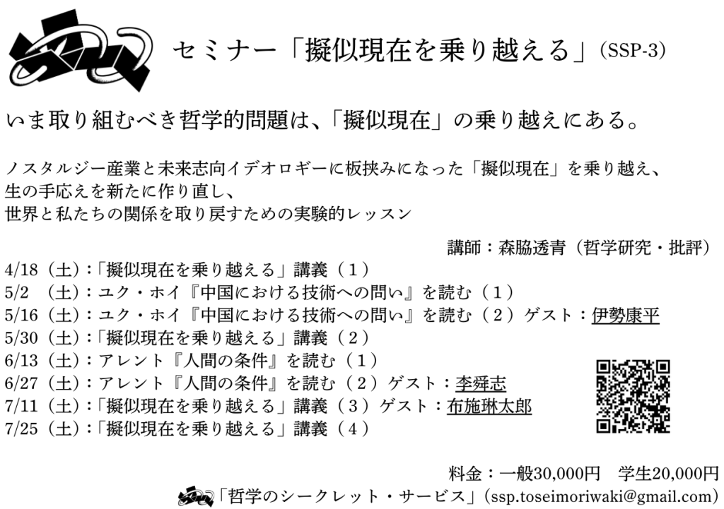 ホイはまさに近代的な「時間」と「新たな感性」の問題を扱っているので、今回のセミナーにとってとても大事な存在です。訳者でもある伊勢さんには、ご自身の興味と合わせてホイについてお話させてもらえたらと思っています。