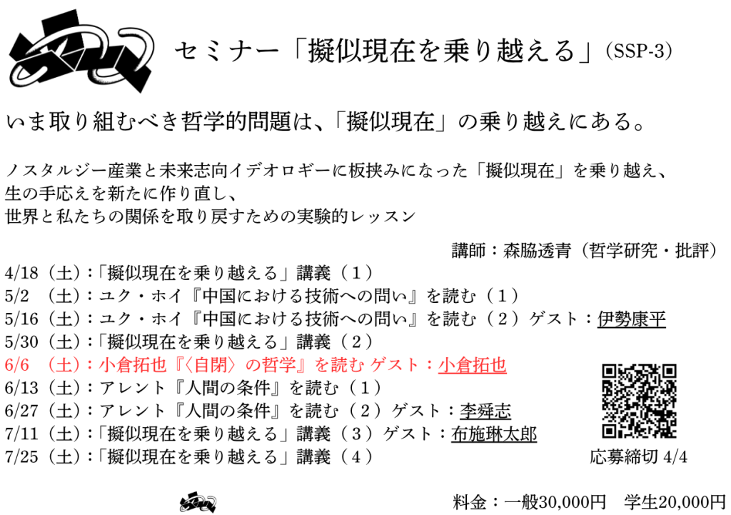 今回、小倉さんが『〈自閉〉の哲学 カオスな世界を生き抜く力』を刊行されたのでさっそく読んでみたのですが、これがとても面白く、今回の僕の講義の内容にとってとても参考になる内容だったので、これは小倉さんの話も聞くしかない! と思った次第です。